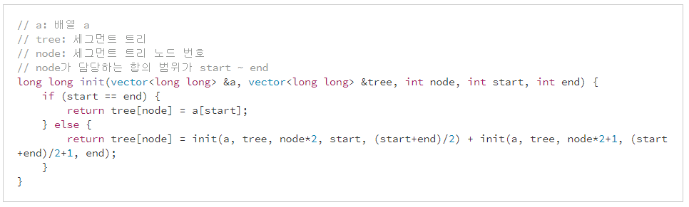 재귀 함수를 이용해서 왼쪽 자식과 오른쪽 자식 트리를 만들고, 범위의 합을 저장해준다.