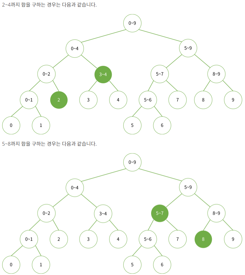 위의 그림처럼 리프 노드에는 주어진 배열의 수를 입력하고, 리프 노드가 아닌 노드에는 연산의 결과 값을 저장한다.